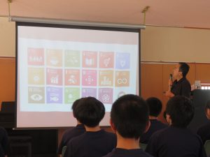 ESD/SDGsの視点を踏まえた地域探究学習を積みかねてきている本校であるが、国際的な視点や知識はどうしても調べ学習の内容(範囲)に留まってしまう。そこで本年度は「元ユニセフ職員 穂積智夫 様」をお招きし、海外の活動経験をもとにSDGsの重要性と世界の現状について講演を頂いた。世界の現状を知ることで、より広い視野で平和、国際理解、持続可能な開発について考えるきっかけとなった。