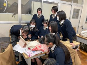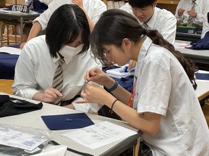 家庭科被服実習に参加し、ボタン付けの手ほどきを受ける台湾大同高校生徒 (写真右)