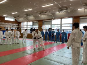 柔道の授業に参加し、技を学ぶ台湾大同高校生徒 (写真奥 水色の柔道着)