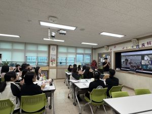 韓国 忠北外国語高校 日本語・英語学科の生徒が本校からの映像を見ている様子