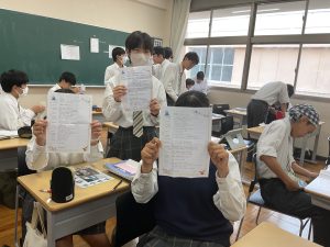 韓国 忠北外国語高校の生徒からもらった手紙を手にする本校生徒たち