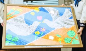 中3ヒロシマ修学旅行にて献納する中3折り鶴レリーフを制作・完成。各クラスの生徒が折った折り鶴を、平和の願う絵ができるようにきれいにはりつけた。