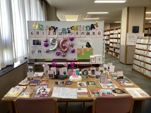 アンネ・フランクの誕生日6/12に合わせて、図書館にて上記フェアを実施。アンネのバラ部門の委員が主体となり、アンネ・フランクにかかわる本を展示したほか、プレゼント類(リボンをつけた箱)、誕生日ケーキ模型、アンネへのメッセージを書いてもらうボードを制作。また、NPO法人ホロコースト教育資料センターが提唱する、ホロコーストを学び考えるためのおすすめ図書である「ココロの本箱」と同じ図書を、本校図書館に展示。全校生徒に対して、アンネの遺志を引き継いで、平和の実現を考える機会になった。