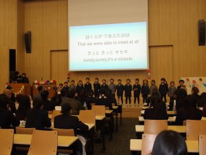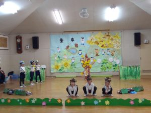 12月に生活発表会があった。5歳児では「わんぱくだんのおにわのようせいたち」のお話を元に、自分たちの経験を話の中に取り入れながらオリジナルの劇をつくっていった。アカガエルやメダカなどの身近な生き物がでてくる場面では“メダカ池救出作戦”での経験を表現遊びとして取り入れた。絵本にも出てくる“ねっこじいさん”は古い木の根っこから生まれることから“みいつけた!寺内町”で見た500歳のイチョウの木を表現していくことになった。話の最後にはカラスの妖精が庭の妖精を追い出しにくるのだが、子どもたちがカラスの気持ちになって物語を話し合う中で互いが受けいれ合い、仲良くなる結末となった。子どもたちは実体験の中で、どんな生き物もそれぞれ生きていくために食べたり食べられたりしていることや、それはどちらかが悪いわけではないということを学んできている。見た目や自分たちの都合で悪者にするのではなく、相手の気持ちに気付いたり知ろうとしたりする姿が見られた。その学びが劇の話をつくる中でも活きていた。劇の最後には『地球に生きているみんなは大切な友達なんだ』という言葉を伝えることになった。子どもたちが日々の生活の中で生き物や身近な自然と関わり、生命の尊さに気付いたり、生き物の気持ちになってどうしたらいいかを友達と考えてきたりしたからこそ、出てきた言葉である。これからも実体験の中で発見したことや気付いたことに、対話を通して考えていくことを大切にしていきたい。