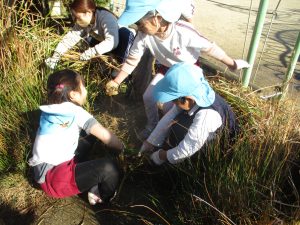 卒園児からメダカ池掃除当番を引き継ぎ、年長児としてメダカ池の生き物が元気に暮らせているかを日々の生活の中で見守り、関わろうとする姿がある。長期休み明けには、「あ!藻が増えてる!」「メダカさんが少なくなってる!」「早くきれいにしてあげよう!」と子どもたち自ら声を上げ、クラス全員でメダカ池掃除が始まった。すると、「ここ水漏れてる」と池の周りが崩れ、そこから水が流れていることに気付いた。「水がなくなったら、メダカさん死んじゃうかも」「だからメダカさんいないのかも」と生き物を心配する子どもたちの姿があった。そこで、クラスで池の周りが崩れた原因を考え、直すことになった。子どもたちからは「池の中に葉っぱや(雑草の)根っこがたくさんあるから、水があふれるのかな」「周りの土が軟らかすぎてグショグショになっているのかな」などの意見が出た。そこで“葉っぱや根っこをとる”“土を作って壁をつくる”この2つを「メダカ池救出作戦」と名付け、クラスで取り組むこととなった。 葉っぱや根っこを取るグループと、土づくりをするグループに子どもたちで相談し分かれた。土づくりでは、柔らかすぎる土にならないよう白い土(砂)と黒い土(粘土質の土)を混ぜることを提案する子どもの姿があり、壁が崩れないように土の硬さや盛る土の量を考えて友達と協力する姿が見られた。1回目の救出作戦のあともまた違うところから水が流れたり、流れたところからタニシが脱走したりし、直したら終わりではなく直したあとも生き物が困っていないかを観察し続ける子どもの姿が見られた。活動の中で、生き物の立場になって池の環境を考えることができた。また、見守り続けることで自分たちがやってみたことがうまくいったかを考えたり、もっと生き物が喜ぶ環境を自分たちで試行錯誤したりする姿につながっていった。