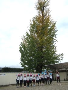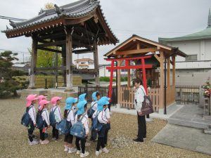 自分たちの住む町について知る“みいつけた!寺内町”の活動を今年度も継続し、1学期には旧杉山家住宅の見学、2学期には4、5歳児で寺内町の町並みを散策した。国の重要文化財を管理されている方々と年3回予定している交流の一つである。寺内町は、昔綿の商いが盛んにおこなわれていたこともあり、例年旧杉山家住宅で綿の栽培体験をさせてもらっていたが、今年度は河内木綿の種をいただき園で栽培し、綿の生長過程を間近で見ながら、収穫する喜びを味わった。また2学期の寺内町散策では、昨年度5歳児が寺内町交流で聞かせてもらった『余九朗きつね』のお話しにでてきた狐をまつっている西方寺を散策ルートに入れてもらい、寺内町に伝わるお話をより身近に感じることとなった。西方寺では実際に狐の祠を見せてもらった。少し悲しいお話で子どもたちからは「狐さんかわいそう」などの声が聞かれた。また、境内の中には大きなイチョウの木があり子どもたちはイチョウの葉の収集に夢中になった。とても大きなイチョウの木で、樹齢は500歳ということを教えてもらった。富田林幼稚園にもイチョウの木があり、ここのイチョウの木と園のイチョウの木の大きさを比べて「幼稚園のイチョウは30歳ぐらいかな」と話す姿も見られた。その後、展望広場や興正寺別院にも行かせていただいた。また、町並みの中で虫籠窓や忍び返しなどの伝統的建造物ならではの景観にも触れることができた。自分たちの住む寺内町の歴史を感じる経験となった。