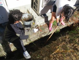 11月からは具体的な整備活動を本格化させた。ビオトープチームは、中庭の丸池や水路の清掃を徹底した。プランターやブロックの撤去、縁の泥落としに加え、水草(ガマの穂)の適切な間引きや水路の泥上げを行い、生物の多様性に配慮した水圏環境を整えた。