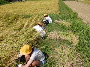 ④内川の地域・人に係わる学習・・・今年度は、 内川で米作りをしている方から米作りのしかたについて学び、田植えや稲刈りの体験をしたりインタビューをし、学んだことをプレゼンテーションソフトでまとめ、文化祭で地域住民、保護者、全校生徒に発信することができた。また、収穫した米はPTA活動の際に児童や保護者で食べることができた。