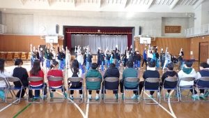 当日。韓国の教職員3名、児童15名の計18名が本校を訪問した。学校内を見学してもらい、その後、高学年が中心になって、歓迎会を行った。日本伝統の舞踊や合唱を披露することができた。6年生の学級に入ってもらって、日本の昔遊び、韓国の遊びを体験し、質問タイムなども設けて、お互いに話をする機会を作った。日本の学校給食も味わってもらうことができた。限られた時間であったが、「お互いを知る」ための活動ができた。