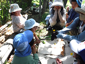 森のムッレ教室は1956年にスウェーデンで考案された環境プログラムです。このプログラムは自然遊びに留まらず、子ども達の野生生物に対する愛情を育み、そして自分達もこの循環する自然界の一部であり自然への責任を持っている存在であることを学びます。森のムッレ教室の資格を持ったリーダーは子どもの主体的な行動へと導き、多くの助言はせず子どもが何かを見つけたり、考える時のサポート的な役割をします。そうして子ども達は自然に触れ、匂い、聞き、見て、質問し考えることを通して、自然がどの様に機能するのかを本能的に学びます。そうした実体験からエコロジカルな考えが育ち、生きものへの愛着と責任感を持つようになります。