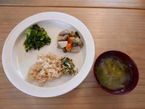 主⾷は栄養豊な⽞⽶を⾷べ、おかずにはお⾁をほとんど使わず、⿂や野菜、発酵⾷品が豊富な薄味の和⾷中⼼の献⽴です。