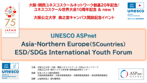 2026年1月11日・12日にアジア・北欧4か国 のUNESCO ASPnet校から生徒・教員合計12名を招聘し、日本(18校)を含めた5か国の中学・高校生によって国際フォーラムが開催された(2日間で366名が参加)。大阪公立大学は支援大学として、大阪・関西地域のユネスコスクール学びあいネットワーク組織である「大阪関西ユネスコスクールネットワーク」(2009年設立)の活動を支援し、過去に蓄積された開催のための諸資源ならびに環境等を提供した。本フォーラムは、参加する幼小中高のASPnet加盟校による「総会」ならびに「コーディネーター会議」を重ねて練られ、かねてより形成されていた国際ネットワークである韓国、タイ、フィリピン、リトアニアのASPnet校とも綿密に連携を取りながら準備されたものである。今次の国際フォーラムのテーマは、「持続可能性を促進していること」、「持続可能性を妨げていること」を主題とし、若者の視点で気がついた生活や社会における事象に基づいて議論が行われた。ディスカッションは、参加国それぞれが抱えている現時点での持続可能性の課題と達成点について出し合い、ESD/SDGsのこれからの学習や取り組みなど、次のステージへ向かう展開となった。この成果は、若者による国際連帯の共同宣言(活動・学習指針)として発表し、既存の学校内の取り組みを発展させながらそれを社会へと広げ、若者世代が協働して進めるSDGsの取り組みを形成することを宣言した。なお、今回の国際フォーラムには、初めてユネスコスクールの幼稚園(富田林市立幼稚園)が参加し、園児による平和の文化をテーマとしたパフォーマンスが行われた。
