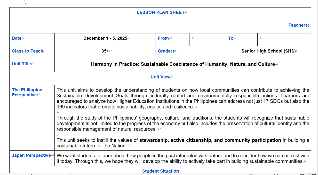 本学、大阪公立大学(OMU)現代システム科学域学生と、フィリピン教育大学(PNU)の学生が2022年度、2024年度、2025年度(30名)にオンラインを通じてESD/SDGsの「共同実践カリキュラム開発」を行った。OMU側は環境学、福祉学、教育学、都市環境、心理学などの学生から構成され、フィリピン教育大学も理系と文系の学生が混在して、多視点・多角的・多面的に両国のSDGs推進上の課題と問題点を取り上げた。相互の問題共有の後、次のステップとして、事実→問題点→価値判断→分析→考察→検証→提案の流れでディスカッションが展開され、対等な関係で共同実践への提案を交わした。これにより、2国間で国を超えた問題の共通性と異なる個別的事情(課題)とを理解しあうことに至り、最終的に国際的に展開するESD/SDGsであることを前提に、国内のドメスティックな視点のみで考察することを逃れて自国の問題と他国との問題を同時に学ぶ学習展開案を作成することができた。これらは、ASPnet支援にも用いられ、高校で実践が試みられる予定である。